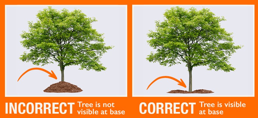 Volcano mulching is a form of incorrect mulch placement against the trunk of a tree. The mulch is installed in a way that resembles a volcano from which the tree trunk appears to be erupting from. You can also spot volcano mulching if the tree trunk's root flare is covered, and only the remaining cylindrical portion of the trunk is visible. While this practice is so prevalent that it seems to have become an accepted mulch application method, it can cause more harm than good for your trees.